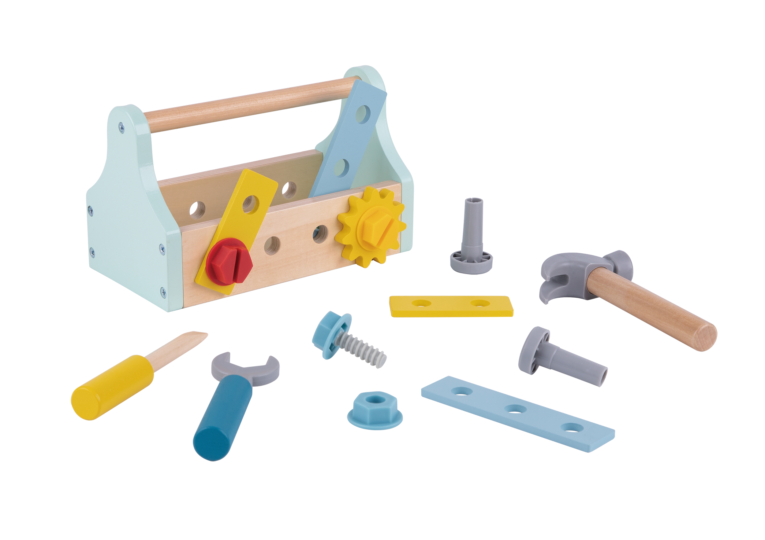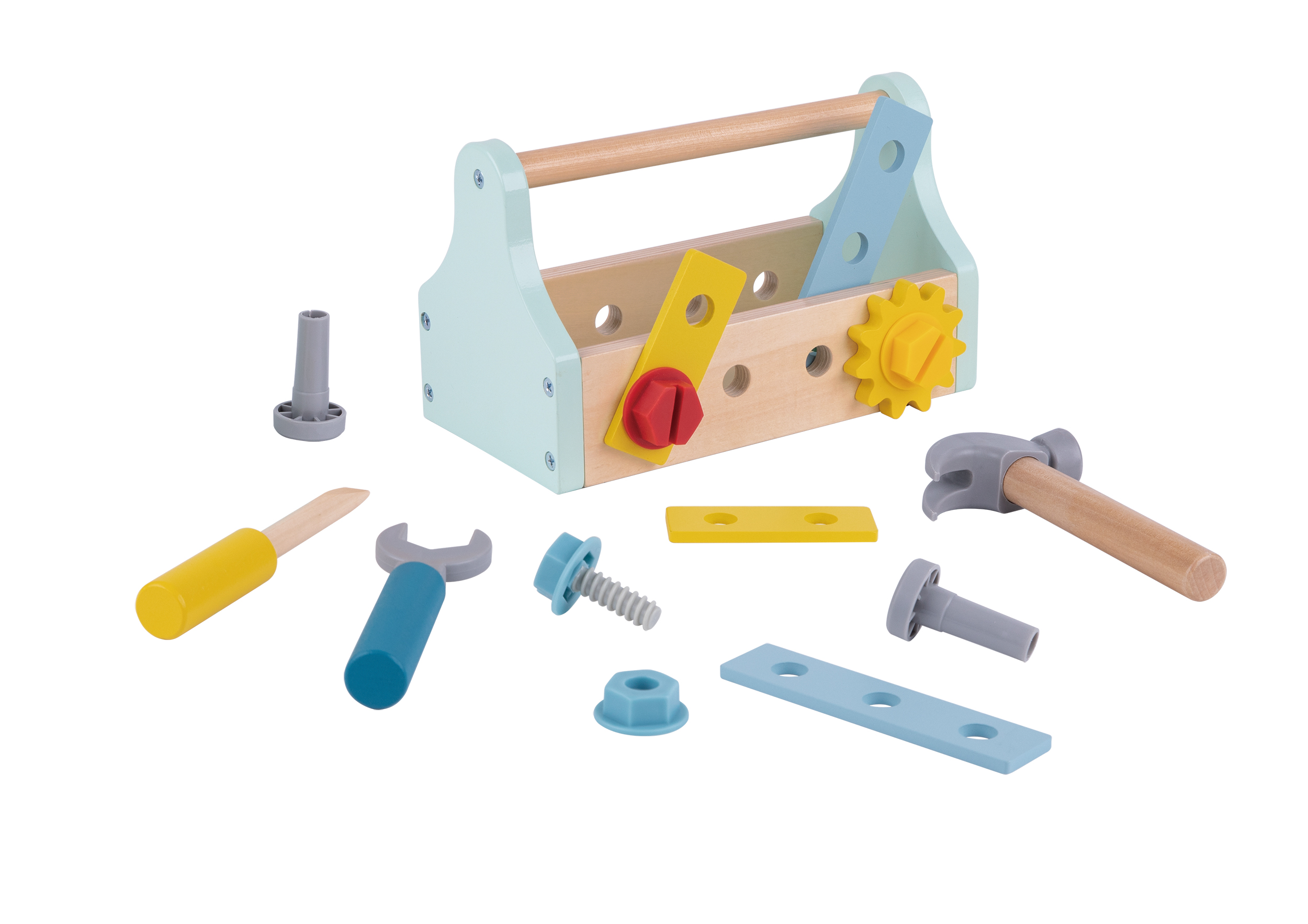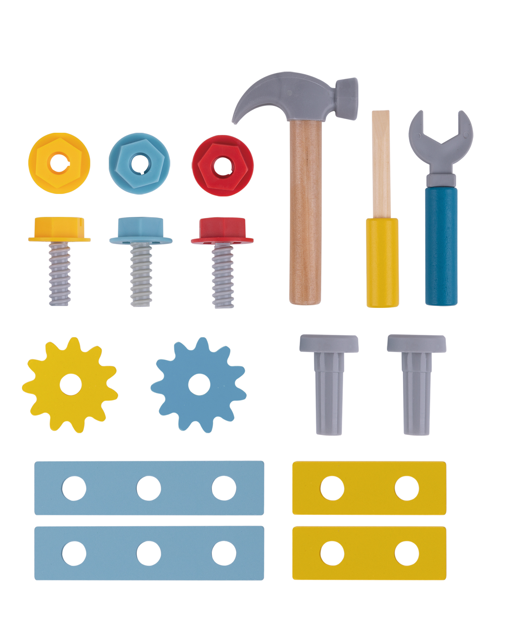 Sadrži sve što je potrebno za male graditelje: čekić, odvijač, matice, vijke, zupčanike i pločice – sve izrađeno od kvalitetnog drva i sigurno za djecu. Zahvaljujući praktičnoj kutiji, alat se može jednostavno nositi bilo gdje, što ga čini savršenim za igru kod kuće, u vrtiću ili na putovanjima.