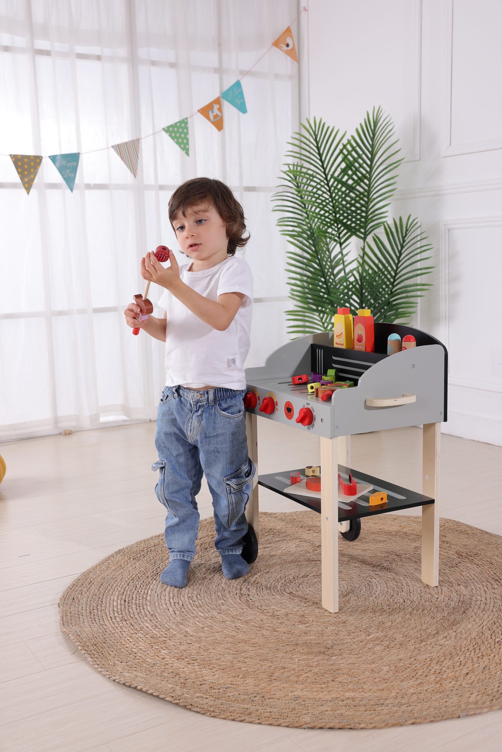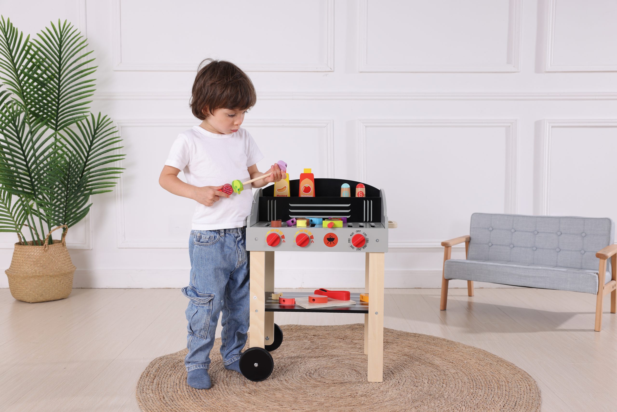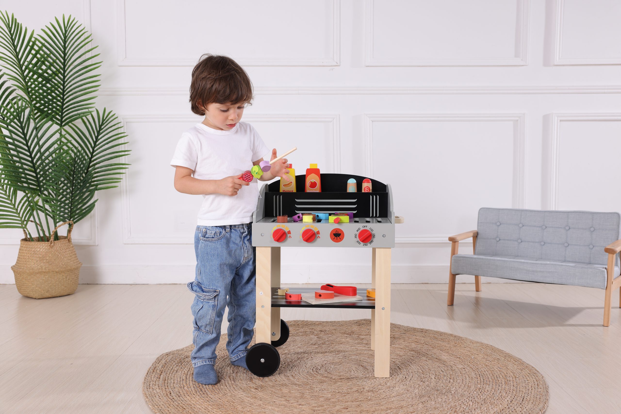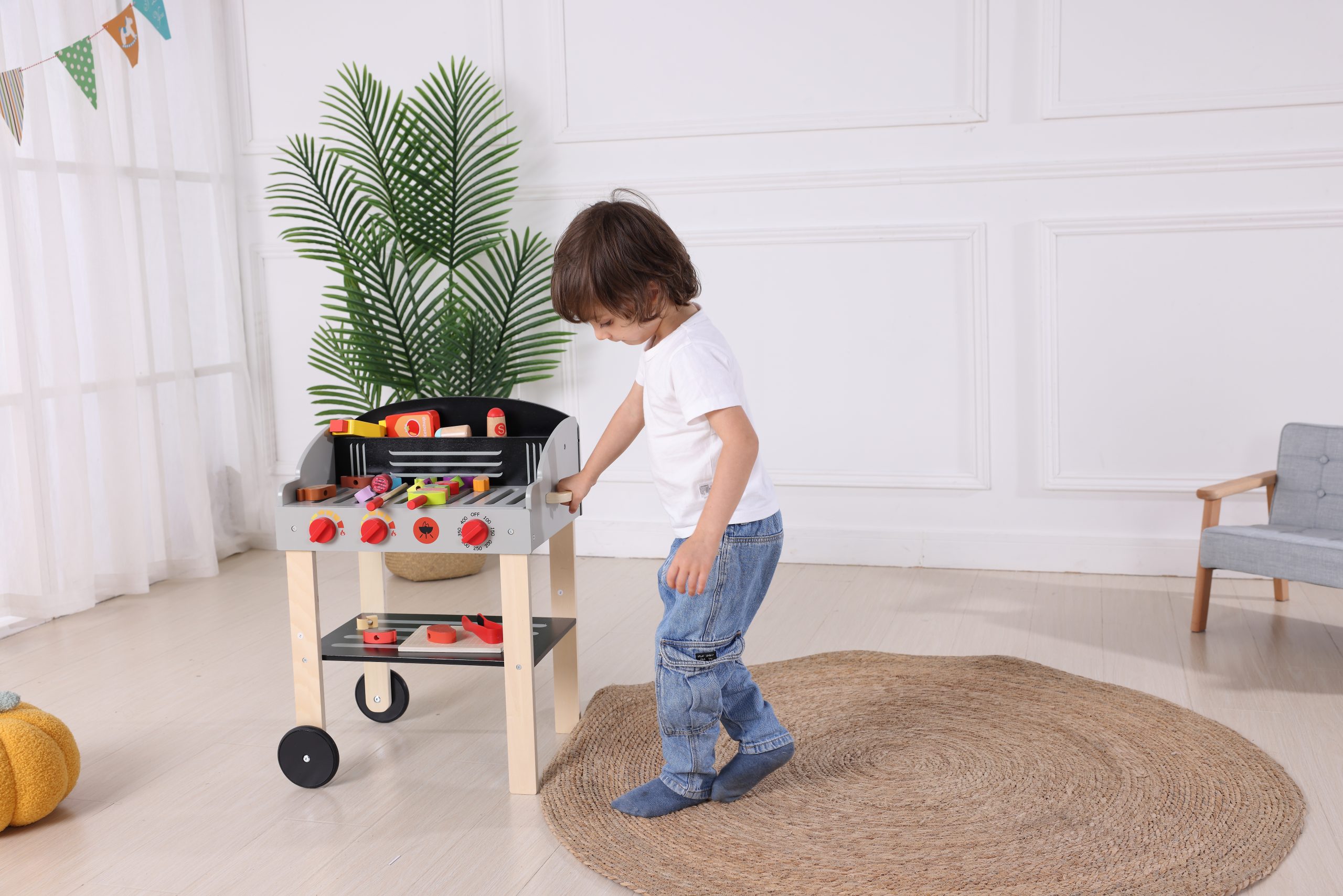 Drveni set za roštilj – Grill Play Set savršen je za male kuhare koji vole igru i kreativnost. Ovaj set uključuje 27 komada pribora, namirnica i dodataka za pripremu ukusnih “jela” na roštilju. Djeca mogu okretati meso, ribu i povrće, dodavati kečap i senf, posipati začine te koristiti roštiljsku lopaticu kako bi stvorila vlastite kulinarske kreacije. Set dolazi s realističnim detaljima poput bočica za umake, soli, papra, povrća, mesa i ribe. Izrađen od kvalitetnog drva, siguran je za djecu i potiče razvoj mašte, motoričkih vještina i socijalne interakcije kroz igru uloga.