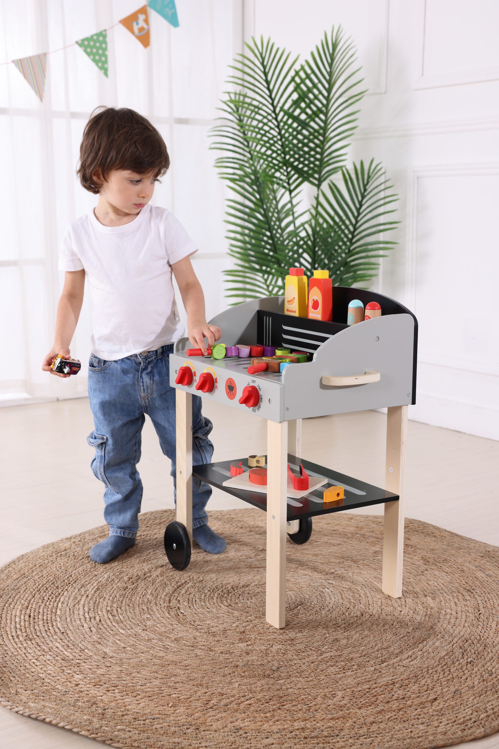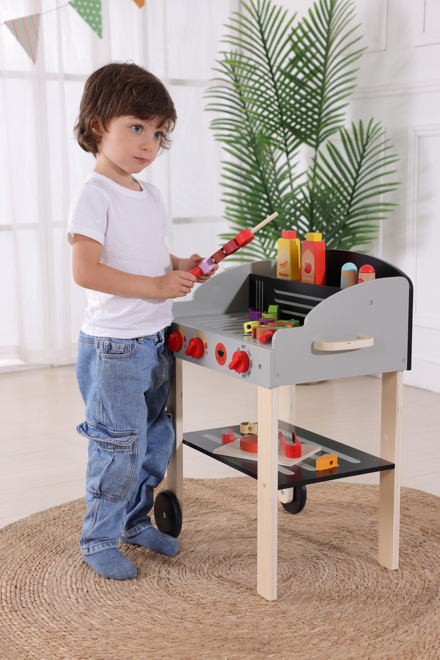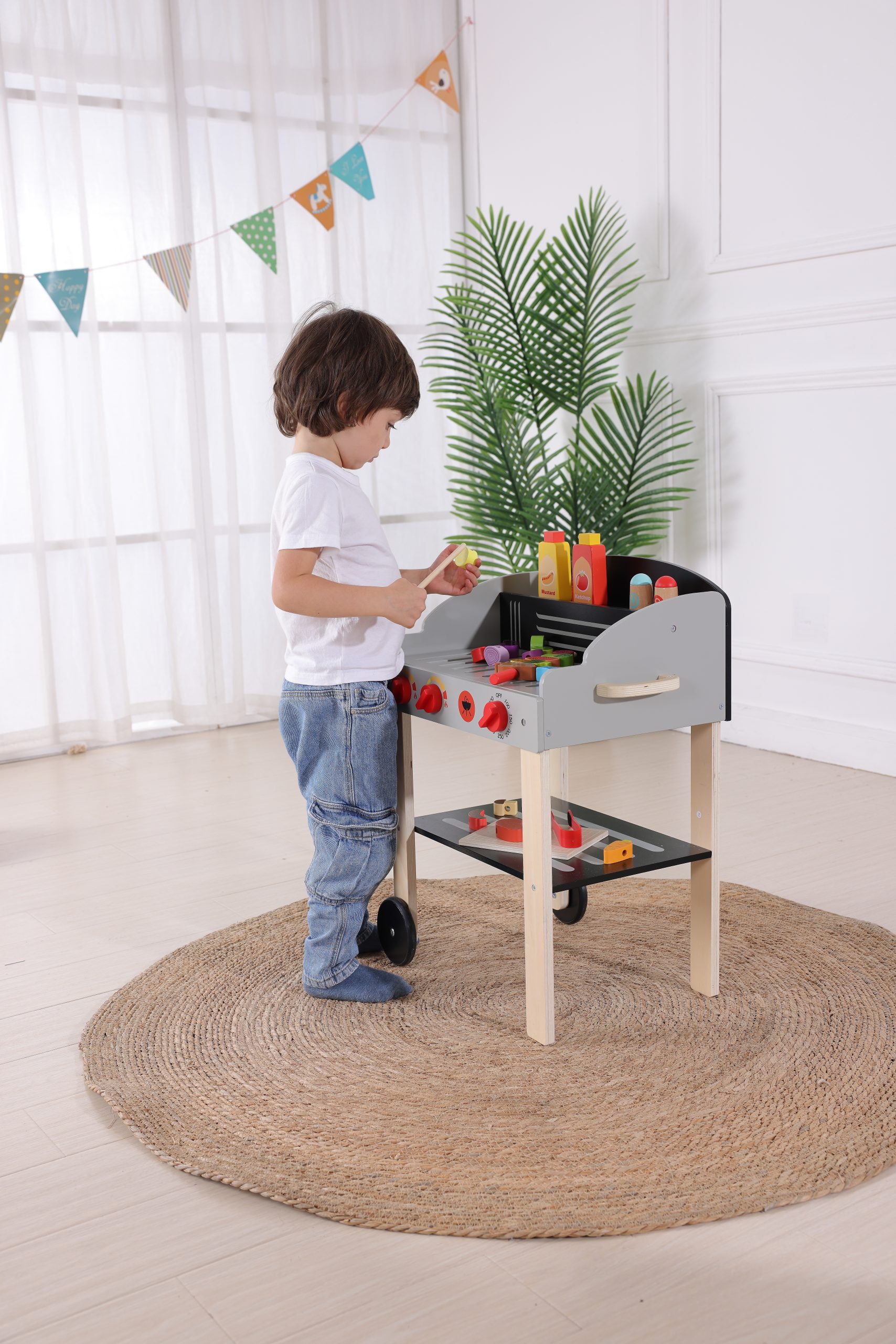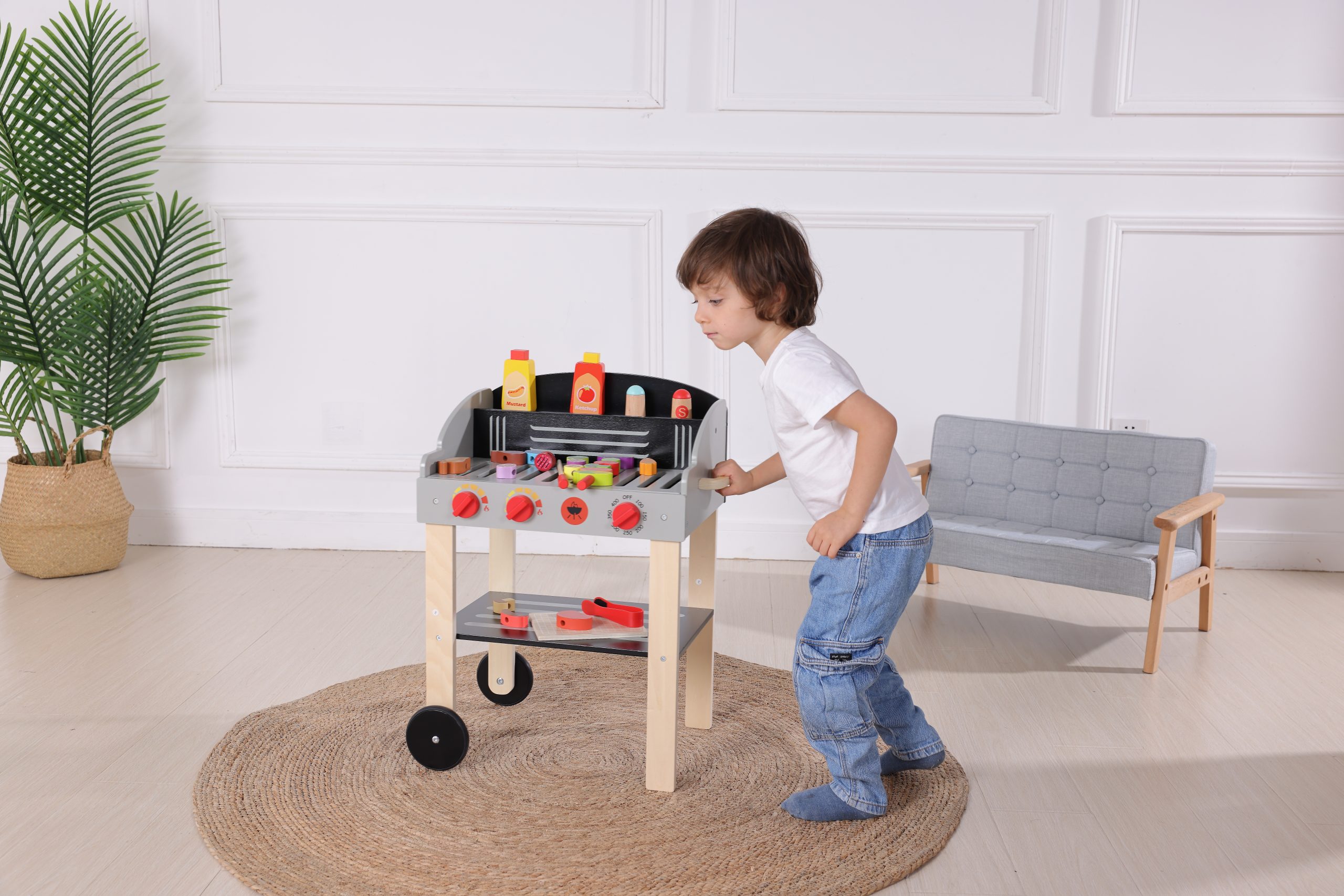 Drveni set za roštilj – Grill Play Set savršen je za male kuhare koji vole igru i kreativnost. Ovaj set uključuje 27 komada pribora, namirnica i dodataka za pripremu ukusnih “jela” na roštilju. Djeca mogu okretati meso, ribu i povrće, dodavati kečap i senf, posipati začine te koristiti roštiljsku lopaticu kako bi stvorila vlastite kulinarske kreacije. Set dolazi s realističnim detaljima poput bočica za umake, soli, papra, povrća, mesa i ribe. Izrađen od kvalitetnog drva, siguran je za djecu i potiče razvoj mašte, motoričkih vještina i socijalne interakcije kroz igru uloga.